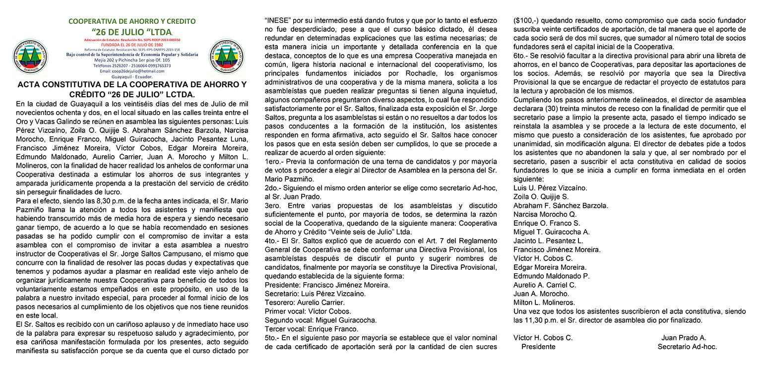 Cooperativa De Ahorro y Crédito 26 De Julio Ltda., es una empresa en Ecuador, con sede principal en Guayaquil. Opera en Cooperativas de Crédito industria. La empresa fue fundada en 10 de junio de 1982.